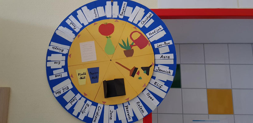 Außerdem helfen alle mit, damit unsere Klasse sauber und ordentlich bleibt. Die Scheibe für die Klassendienste sorgt dafür, dass jeder mal dran ist.