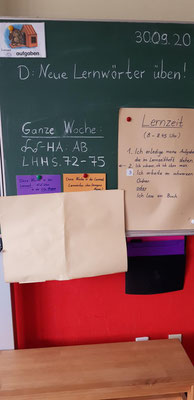 In der Lernzeit ist auch Zeit zum Üben! Die Lernwörter in der orangenen Mappe werden täglich trainiert, falls dies nötig ist. Jedes Kind soll alle Wörter in dieser Mappe richtig schreiben können! So bauen wir über 4 Grundschuljahre einen großen Wortschatz auf.